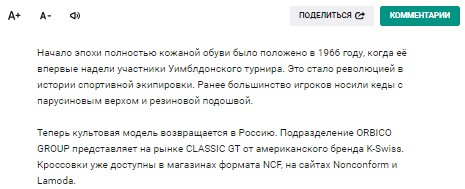было положено в 1966 году, когда её впервые надели участники Уимблдонского турнира. Это стало революцией в истории спортивной экипировки.Ранее большинство игроков носили кеды с парусиновым верхом и резиновой подошвой.